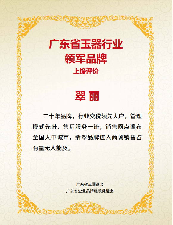 上榜理由:二十年品牌,行业交税领先大户,管理 模式先进,售后服务一流,销售网点遍布 全国大中城市,翡翠品牌进入商场销售占 有量无人能及。